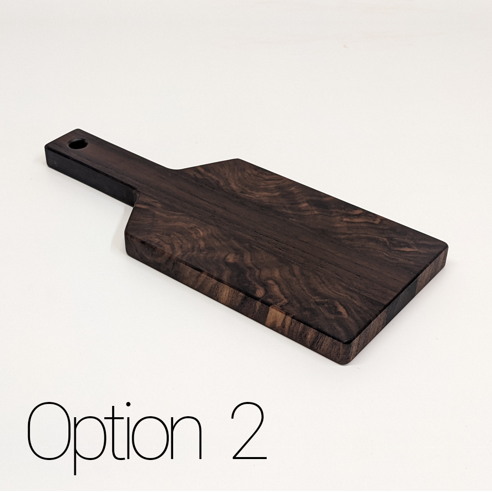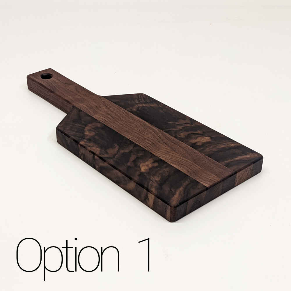 Each solid walnut paddle features a beautiful, one-of-a-kind, symmetrical grain pattern. Whether you use this as a small charcuterie board or take it camping to prepare food in the wilderness, this paddle is ready for anything!