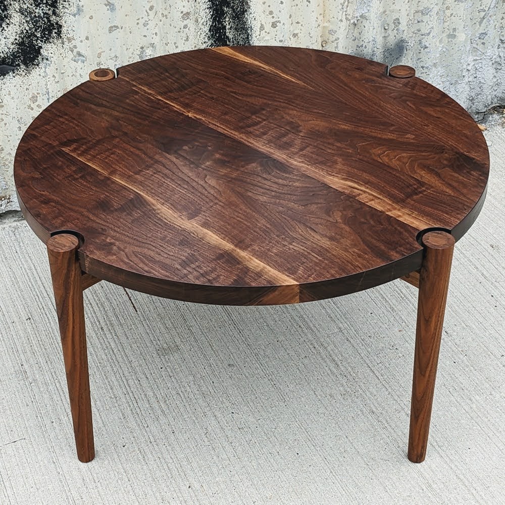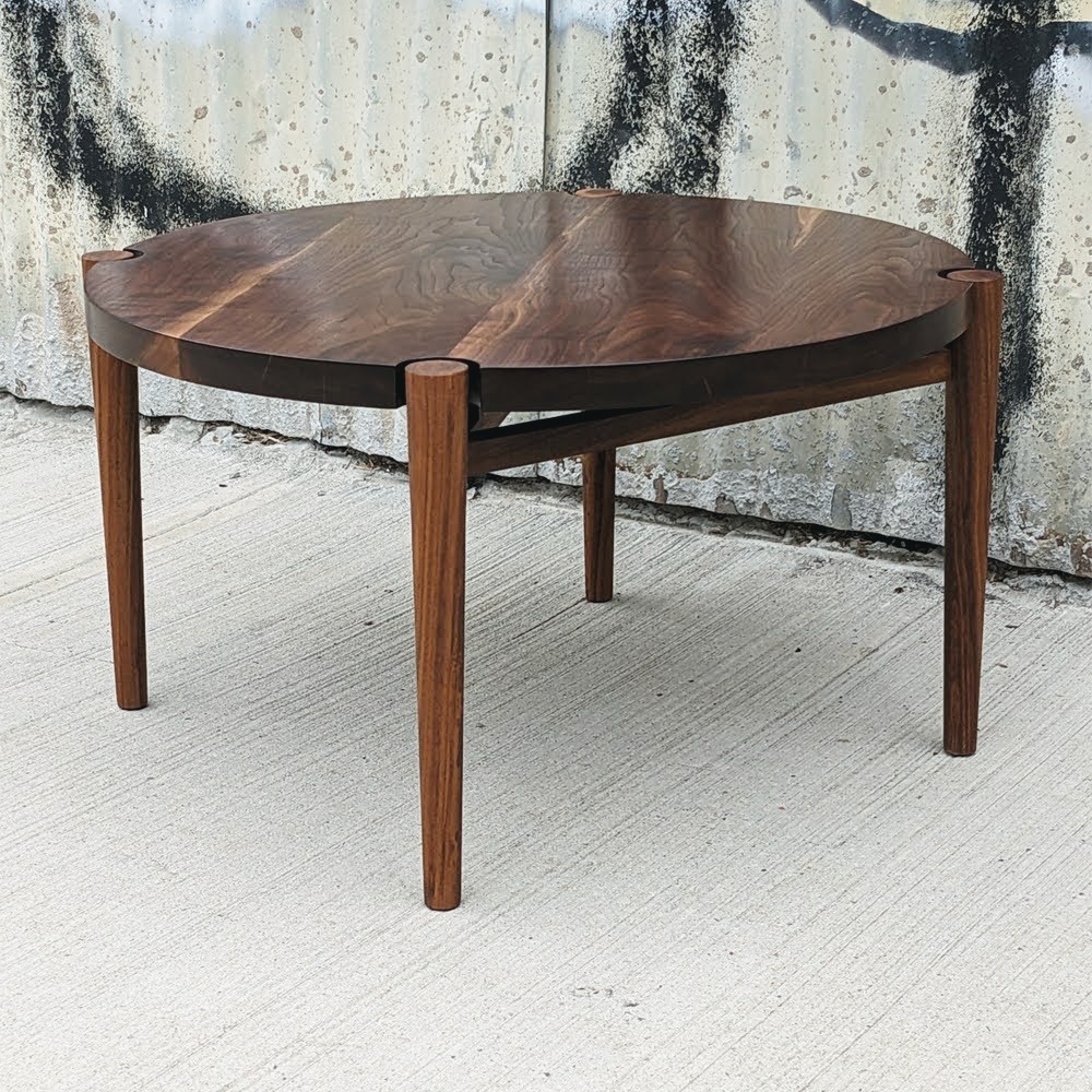 This modern walnut coffee table features a unique circular top that appears to float above its supports.